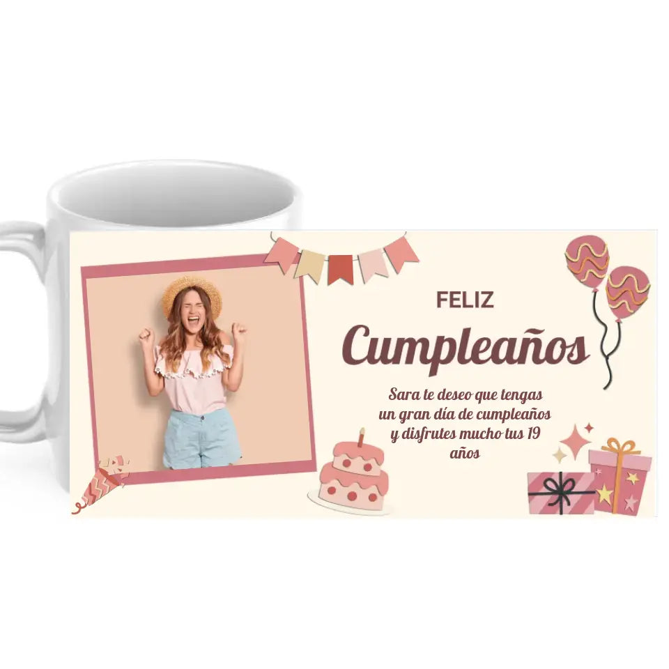 Taza de cumpleaños de colores rosas que puedes personalizar con la foto y la dedicatoria que tú quieras. Perfecta para regalar en el cumpleaños de tu amiga, hermana, prima o quien tú quieras.