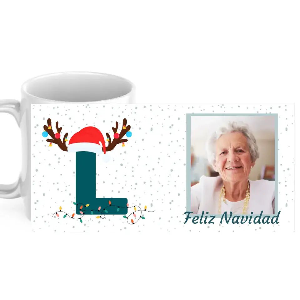 Taza con inicial navideña en la que puedes elegir la inicial que desees y además incluir la foto que quieras con un pequeño mensaje a personalizar.
